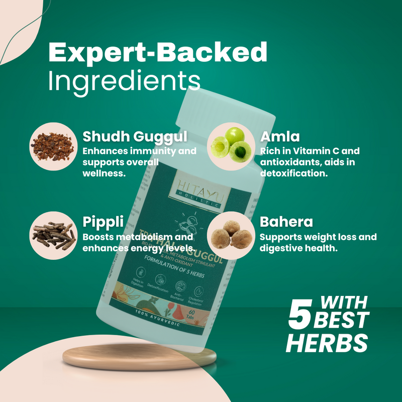 Amla, rich in Vitamin C, aids detoxification. Bahera supports weight loss and digestion. Harad promotes youthful skin. Pippli boosts metabolism and energy. Sudh Guggulu enhances immunity and wellness.