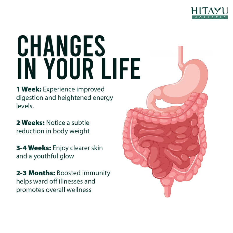 Experience improved digestion and heightened energy levels in one day, notice subtle body weight reduction in a week, enjoy clearer skin and a youthful glow, and boost immunity for overall wellness in seven to twelve weeks.
